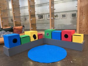 Kuvissa piilossa olevia lasten tekemiä tauluja, käsintehtyjä leluja ja kurkistus- ja tunnustelulaatikoita.